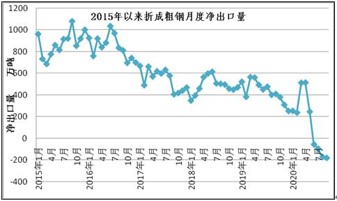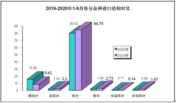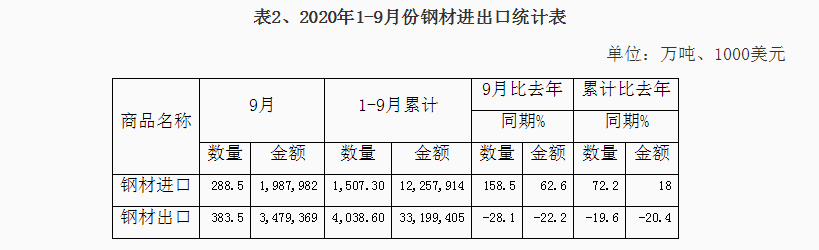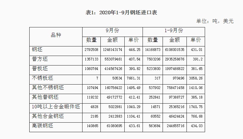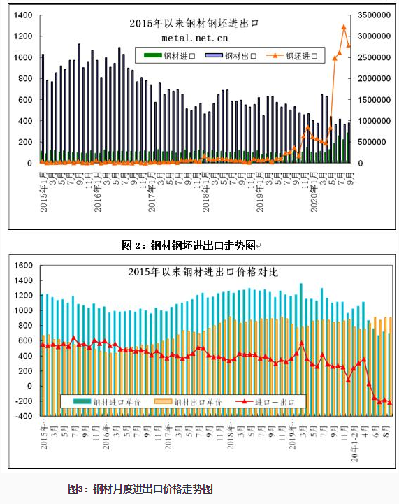 2020年1-9月份鋼材、鋼坯進出口走勢 9月份中國進口鋼坯279.3萬噸仍處高位,鋼材進口288.5萬噸,較上月增加64.4萬噸,6-9月份連續(xù)四個月我國為粗鋼凈進口,并且凈進口量逐月增加。 圖1:折成粗鋼月度凈出口 一、鋼材、鋼坯進出口情況 1、鋼坯進口情況 2020年9月進口鋼坯279.3萬噸,進口平均價格為446.3美元/噸,較上月增加36.5美元/噸,1-9月份鋼坯進口1416.7萬噸,同比增長932%,進口平均價格為431美元/噸,其中普方坯和普板坯分別進口750.3萬噸和523.4萬噸。1-9月份鋼坯出口1.48萬噸。 2020年1-9月份普方坯進口主要來自印度、俄羅斯聯(lián)邦、越南、伊朗、馬來西亞、烏克蘭、印度尼西亞、阿曼、日本、哈薩克斯坦、韓國、阿聯(lián)酋和巴西,分別進口202.8萬噸、127.3萬噸、102.5萬噸、81.6萬噸、74.8萬噸、39.3萬噸、35萬噸、26萬噸、16.8萬噸、12萬噸、9.4萬噸、8.1萬噸和7.7萬噸。 2020年1-9月份普板坯進口主要來自俄羅斯聯(lián)邦、巴西、越南、阿聯(lián)酋、印度、印度尼西亞、日本、伊朗、墨西哥、韓國、烏克蘭、沙特阿拉伯、哈薩克斯坦和阿曼,分別進口141.1萬噸、91.2萬噸、59萬噸、35.4萬噸、34.7萬噸、33萬噸、31.2萬噸、26.7萬噸、23.1萬噸、14.7萬噸、8.7萬噸、7.7萬噸、6.9萬噸和5.5萬噸。 2、鋼材進出口情況 2020年9月鋼材出口383.5萬噸,同比降低28.1%,出口金額同比降低22.2%,1-9月份鋼材出口4038.6萬噸,同比降低19.6%,出口金額同比降低20.4%;9月份進口鋼材288.4萬噸,同比增長158.5%,進口金額同比增長62.6%,1-9月份進口鋼材1507.3萬噸,同比增長72.2%,進口金額同比增長18%。 9月份鋼材進口保持高位,9月份鋼材凈出口94萬噸,9月份進口鋼坯279.3萬噸,進口鋼錠4345噸,出口鋼坯鋼錠779噸,折成粗鋼9月份凈進口179.5萬噸,較上月的凈進口增加10萬噸,6-9月份粗鋼凈進口量連續(xù)四個月不斷增加。 1-9月份鋼材凈出口2531.3萬噸,鋼坯進口1416.7萬噸,鋼錠進口5.1萬噸,鋼坯、鋼錠出口1.6萬噸,1-9月份折合成粗鋼凈出口1263萬噸。 從貿(mào)易額看,1-9月份鋼材進口貿(mào)易額122.6億美元,出口貿(mào)易額332億美元,進出口貿(mào)易總額順差209.4億美元。9月份進口單價為688.1美元/噸,較上月降低20.2美元/噸,與去年同期相比降低412美元/噸,出口單價為907.3美元/噸, 9月份出口單價再次超過進口單價218.2美元/噸。 圖3:鋼材月度進出口價格走勢圖 按貿(mào)易方式分,1-9月份出口鋼材中一般貿(mào)易出口3874萬噸,占出口量的95.9%,1-9月份進口鋼材中一般貿(mào)易進口1262.2萬噸,占鋼材進口量的83.7%,進料加工貿(mào)易進口157.8萬噸,占進口量的10.5%。 分國家/地區(qū)進出口 從分國家/地區(qū)進口情況看,9月份主要進口國家和地區(qū)是韓國、日本、中國臺灣、印度、馬來西亞、越南、烏克蘭、印度尼西亞和俄羅斯聯(lián)邦,分別進口56.2萬噸,53.5萬噸、39.6萬噸、36.6萬噸、25.4萬噸、14.5萬噸、11萬噸、10萬噸和8.1萬噸,從上述國家/地區(qū)進口占9月份進口量的88.4%。其中從印度進口平均價格為449.6美元/噸,馬來西亞進口平均價格為430.8美元/噸,烏克蘭進口平均價格為398.7美元/噸,俄羅斯進口平均價格為408.2美元/噸,從這些國家進口的鋼材大幅拉低了進口平均價格。 1-9月份鋼材主要進口自韓國、日本、印度、中國臺灣、馬來西亞、印度尼西亞、德國、俄羅斯聯(lián)邦、哈薩克斯坦、越南、烏克蘭、瑞典和荷蘭,分別進口390.8萬噸、359.1萬噸、170萬噸、150.6萬噸、136.9萬噸、60.8萬噸、39.9萬噸、28.1萬噸、27.6萬噸、24.7萬噸、23.9萬噸、12.8萬噸和11.9萬噸,進口中國產(chǎn)鋼材10.9萬噸。2019年1-9月份從日本、韓國、中國臺灣進口占進口量的83.8%,今年1-9月份從日本、韓國和中國臺灣進口僅占進口量的59.7%,而從印度、馬來西亞和印尼的進口分別占到了11.28%、9.1%和4.2%。 圖4:鋼材分國別進口對比 從分地區(qū)鋼材出口情況看,1-9月份出口亞洲2777萬噸,占出口量的68.8%,出口非洲471萬噸,占出口量的11.7%,出口歐盟175萬噸,占出口量4.3%,出口南美秘魯、智利和巴西三個國家的數(shù)量為203萬噸,占出口量的5%,出口美國、墨西哥和加拿大三個北美國家的數(shù)量在106萬噸,占出口量的2.6%。 從具體的分國家/地區(qū)出口情況看,1-9月份出口量比較大的國家是韓國、越南、泰國、菲律賓、印度尼西亞緬甸、沙特阿拉伯和阿拉伯聯(lián)合酋長國,分別出口了437.8萬噸、330.6萬噸、298.8萬噸、224.3萬噸、155.5萬噸、133.1萬噸、126.5萬噸和108.9萬噸。 1-9月份出口量在70萬噸以上的國家和地區(qū)有巴基斯坦、印度、馬來西亞、中國香港、秘魯和智利,出口尼日利亞、日本、中國臺灣、新加坡、巴西、孟加拉國、美國、美國、俄羅斯聯(lián)邦和土耳其的數(shù)量在50萬噸以上,出口意大利、加納、埃及、澳大利亞、哥倫比亞、肯尼亞、烏茲別克斯坦、南非和科威特的數(shù)量在30萬噸以上,出口蒙古、墨西哥、伊朗、西班牙、加拿大、加拿大、伊拉克、厄瓜多爾、坦桑尼亞、烏克蘭、比利時、阿曼、吉布提、以色列和危地馬拉的數(shù)量在20萬噸以上,出口斯里蘭卡、阿爾及利亞、洪都拉斯、卡塔爾、蘇丹、老撾、科特迪瓦共和國、哈薩克斯坦、荷蘭、哥斯達黎加、安哥拉、柬埔寨、也門共和國、德國、多米尼加共和國、莫桑比克、摩洛哥和幾內(nèi)亞的數(shù)量在10萬噸以上。 鋼材分品種進出口 從鋼材分大類品種的出口看,1-9月份板材出口2446萬噸