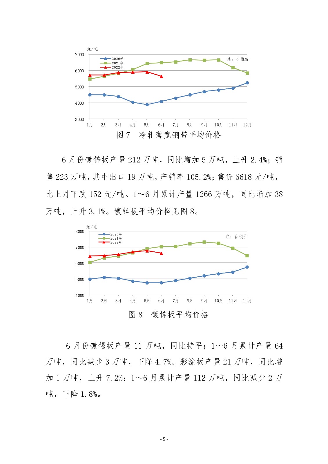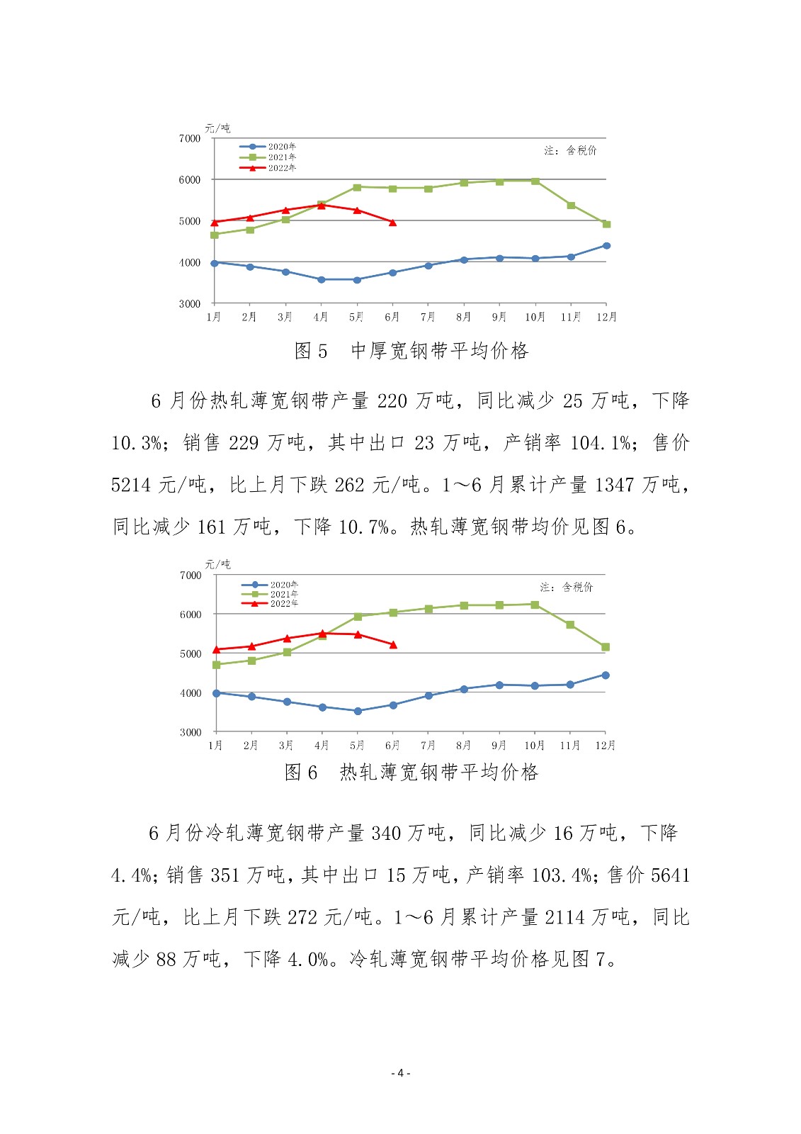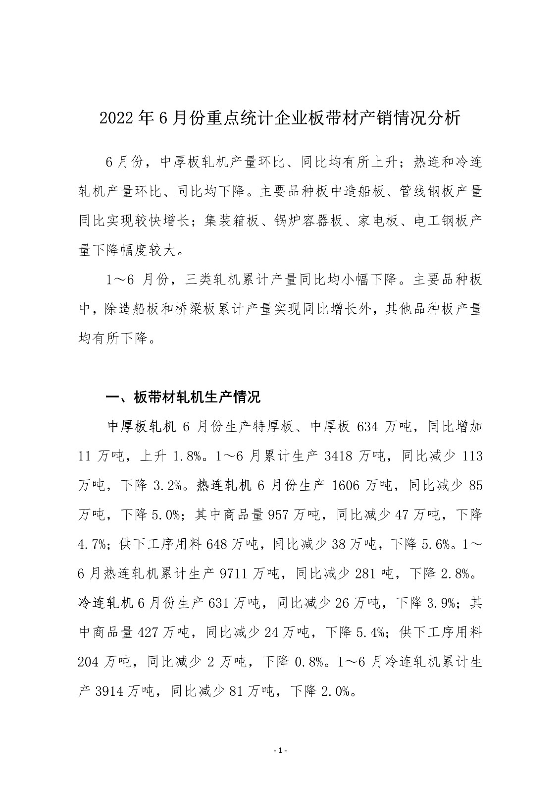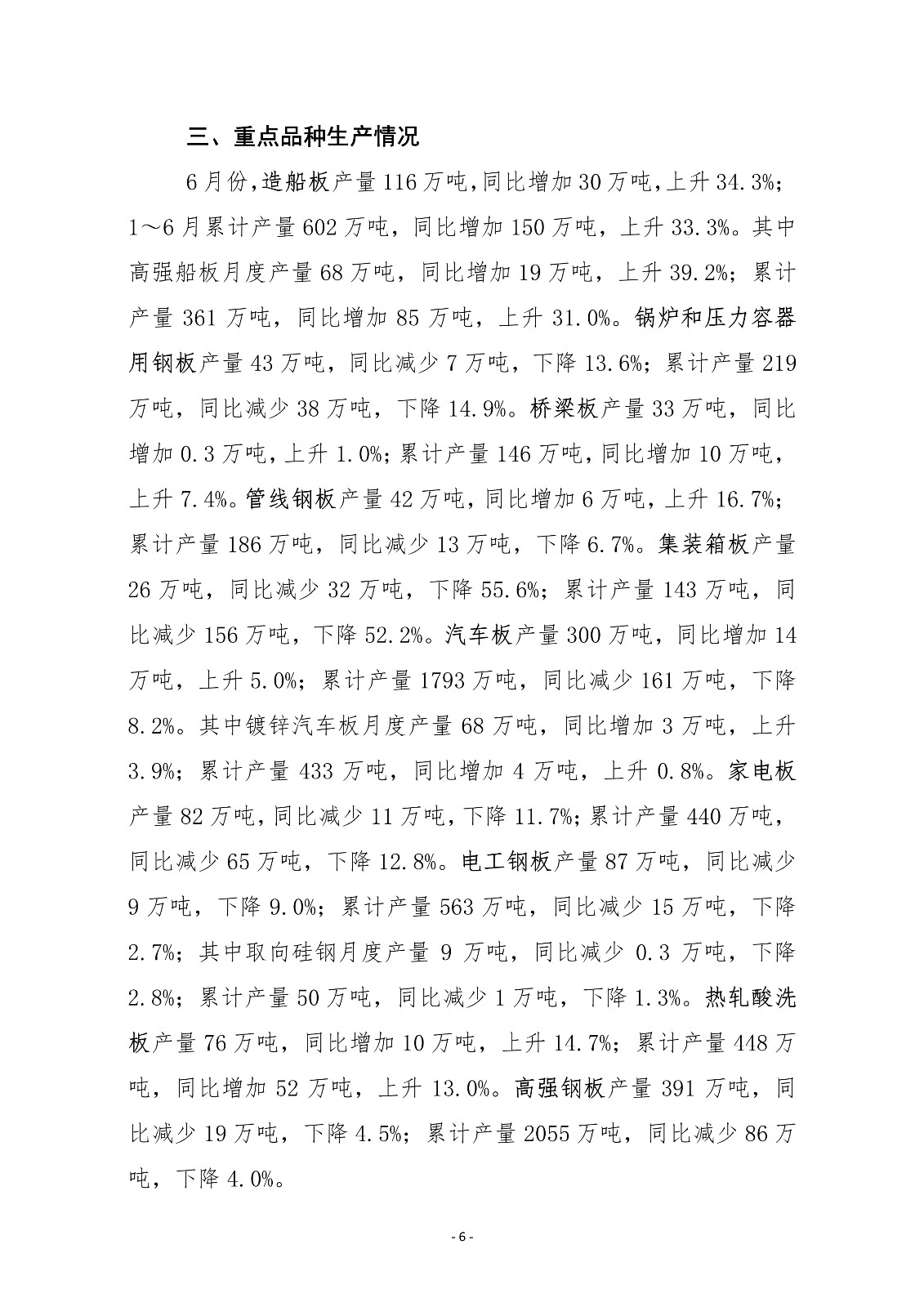 6月份,中厚板軋機(jī)產(chǎn)量環(huán)比、同比均有所上升;熱連和冷連軋機(jī)產(chǎn)量環(huán)比、同比均下降。主要品種板中造船板、管線鋼板產(chǎn)量同比實(shí)現(xiàn)較快增長;集裝箱板、鍋爐容器板、家電板、電工鋼板產(chǎn)量下降幅度較大。1~6月份,三類軋機(jī)累計(jì)產(chǎn)量同比均小幅下降。主要品種板中,除造船板和橋梁板累計(jì)產(chǎn)量實(shí)現(xiàn)同比增長外,其他品種板產(chǎn)量均有所下降。